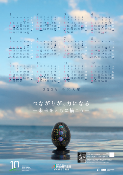 今回は能登半島地震からの復興への想いを込め、「つながりが、力になるー未来をともに描こうー」をテーマに、輪島塗蒔絵作家の小西紋野さんの作品を奥能登珠洲市の海岸で撮影したカレンダーを制作しました。静かな能登の海をバックに、卵を小さな宇宙に見立てて星のまたたきを細かく絵付けした作品が、これから始まる能登の未来を感じさせます。